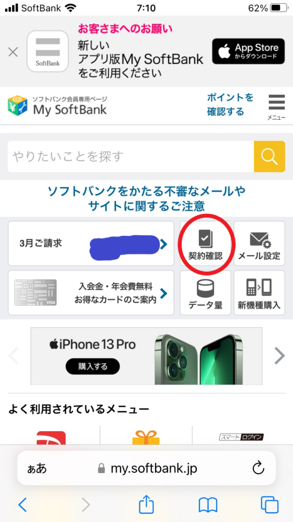 My SoftBankがよく分からない場合は、ネットで「マイソフトバンク」
