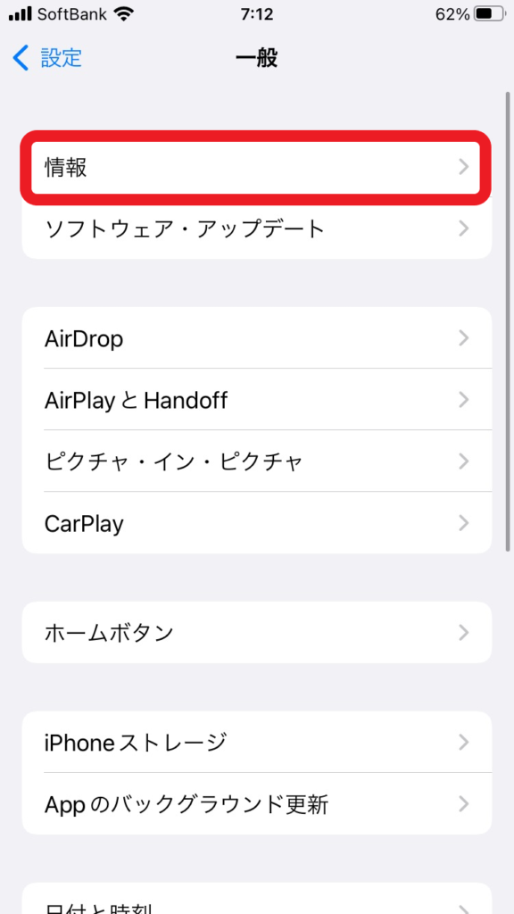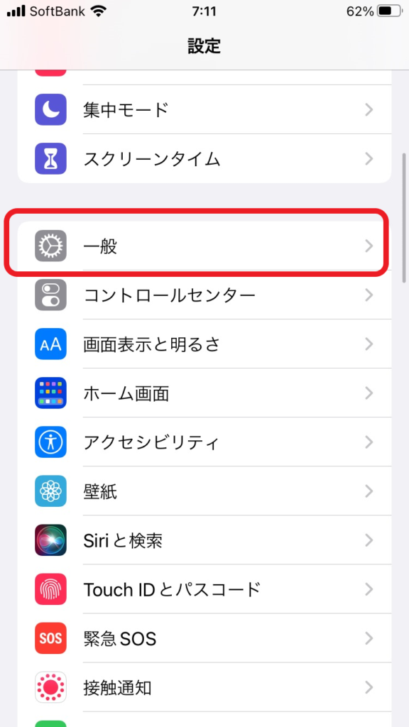 ②次の画面。下の方に進むと「一般」があるのでタップ。